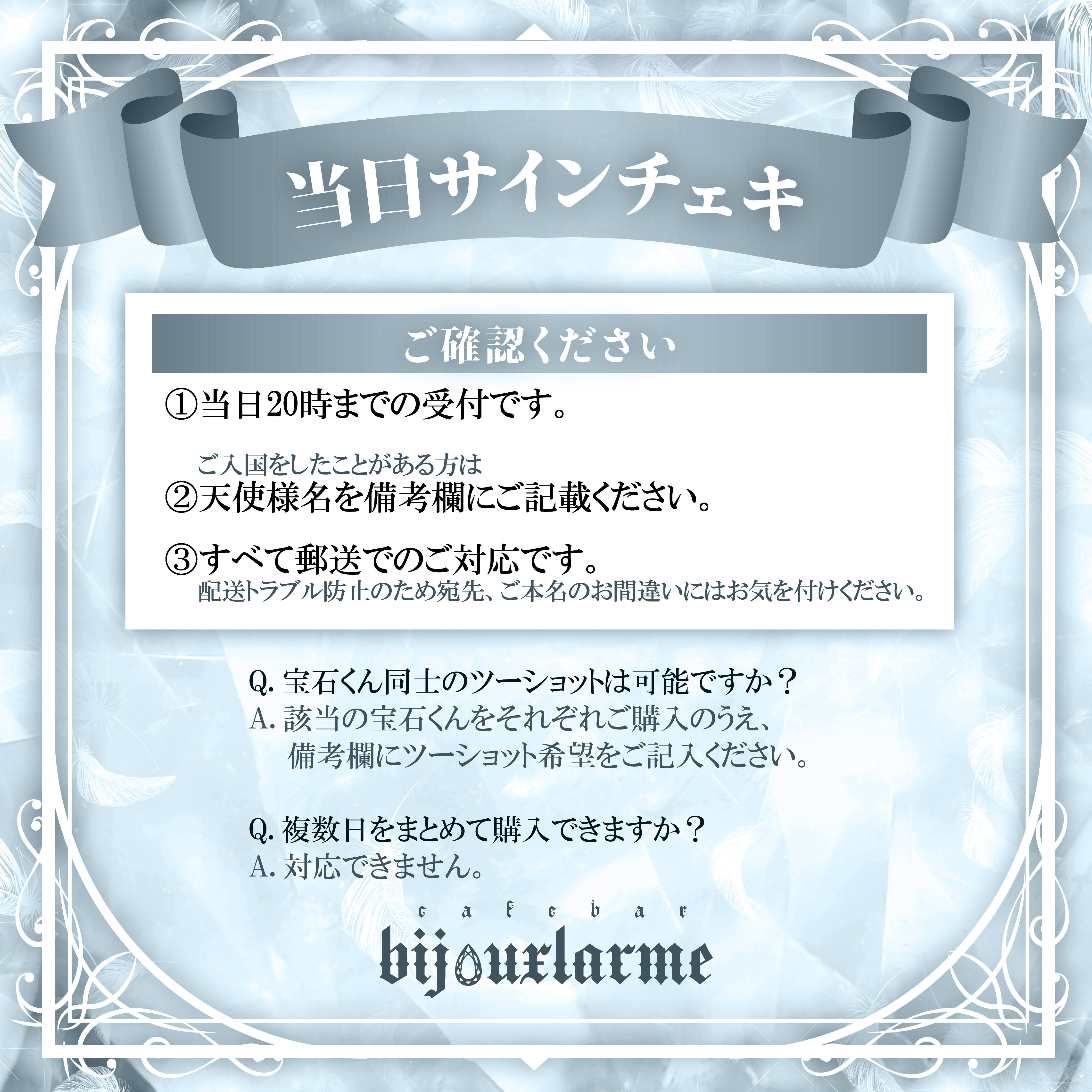 ※チェキ等サイン、デコが必要なものに関しましてはキャストの出勤日により発送まで2,3週間頂く場合もございます。不要の際はご購入時にメッセージよりご連絡ください。